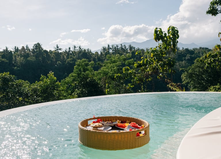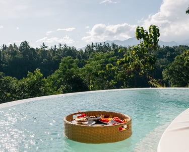 Start your morning in the most refreshing way — with a floating breakfast surrounded by nature. Enjoy a delicious selection of local and international dishes served on a handcrafted tray that gently drifts across your private pool.