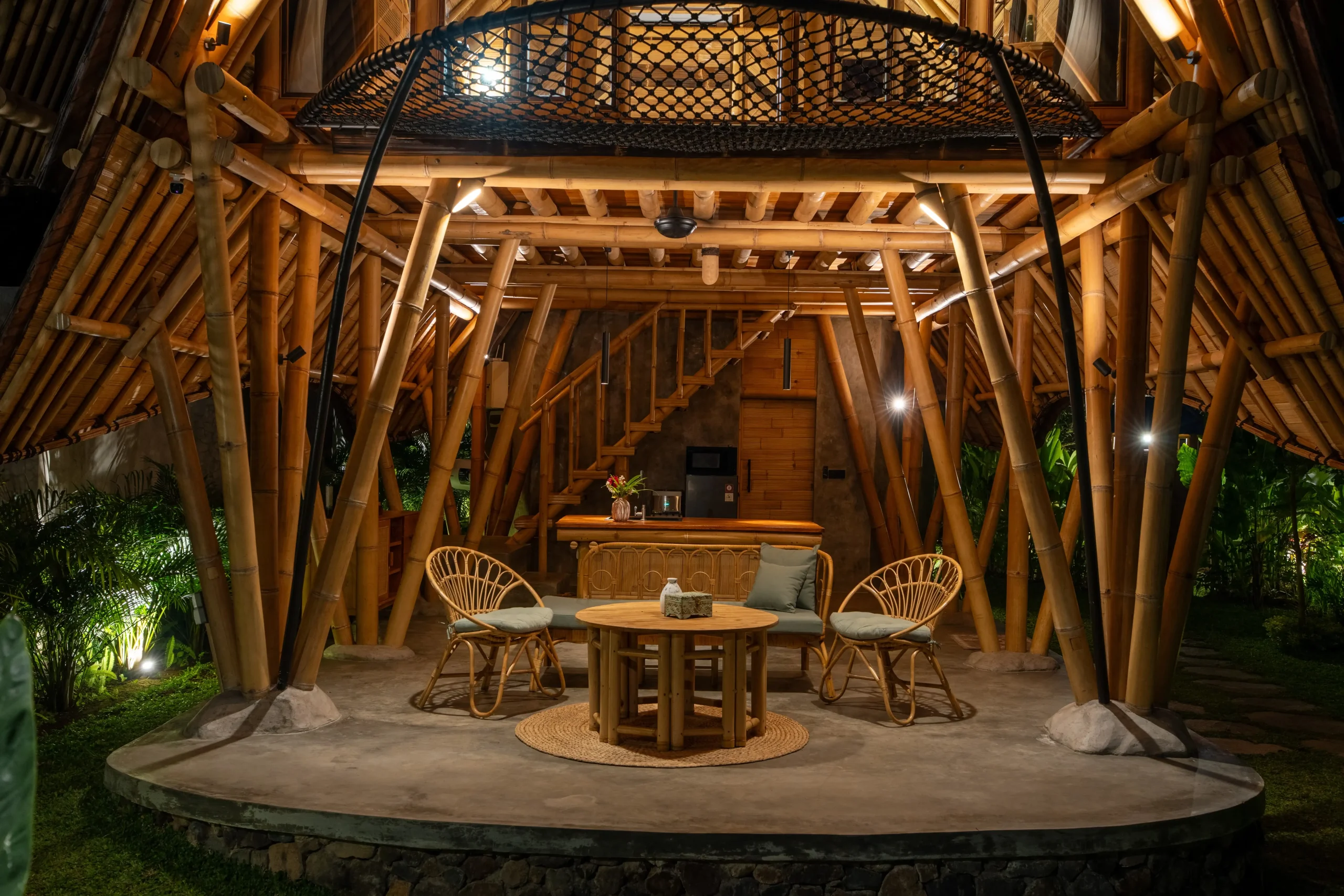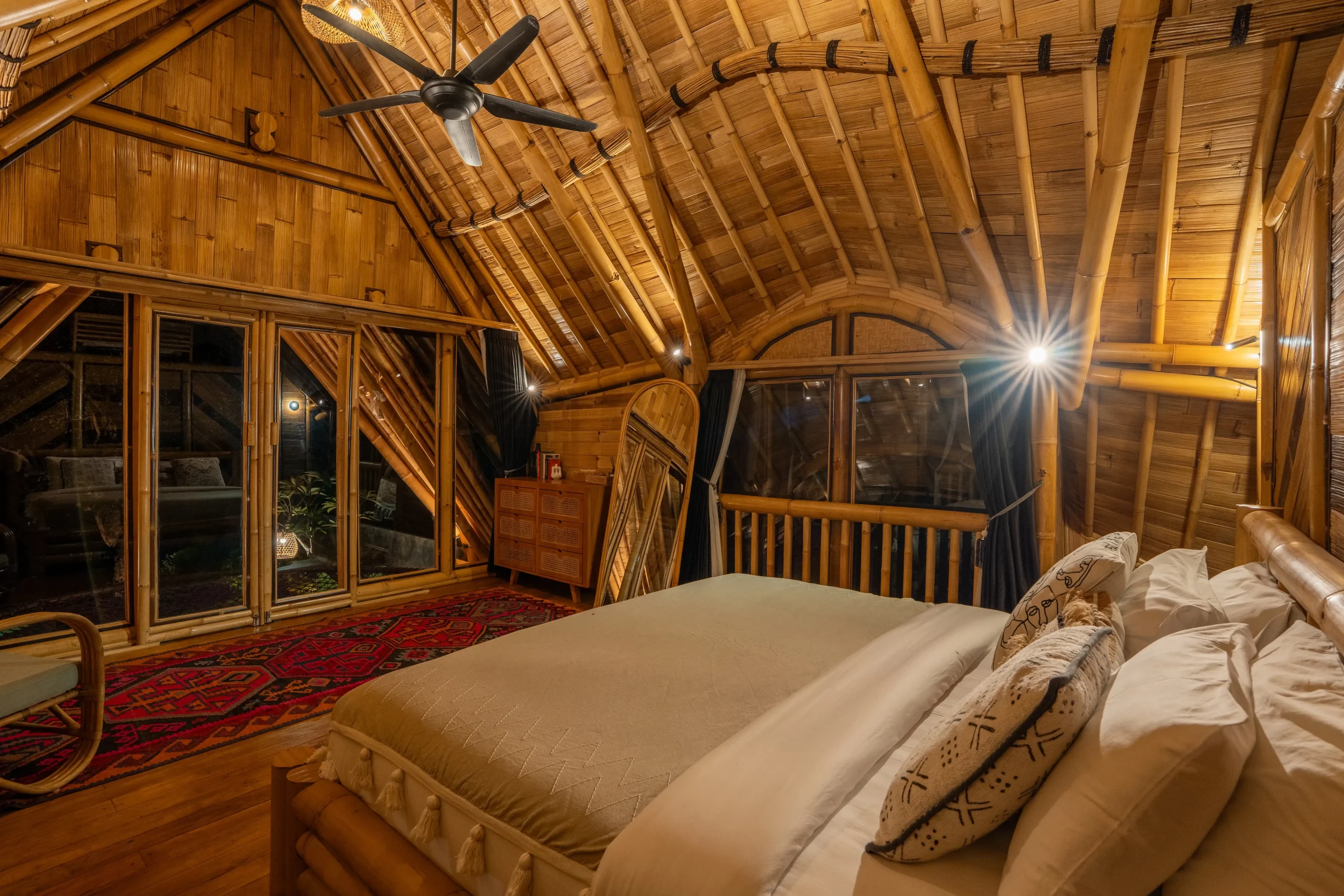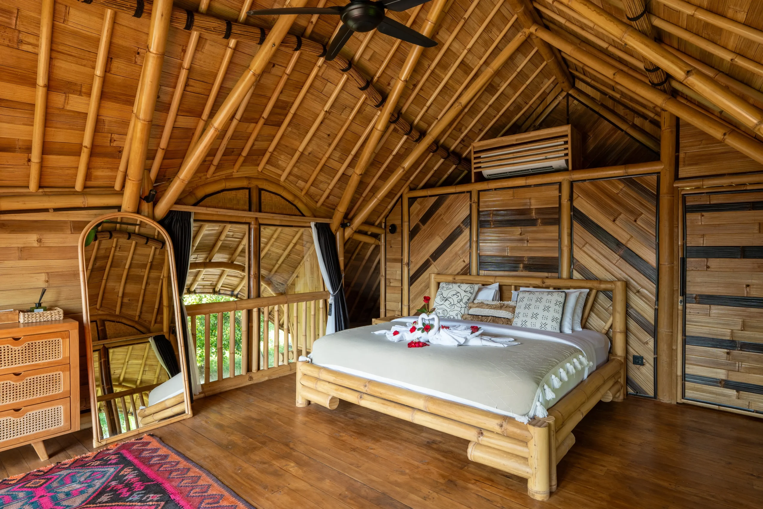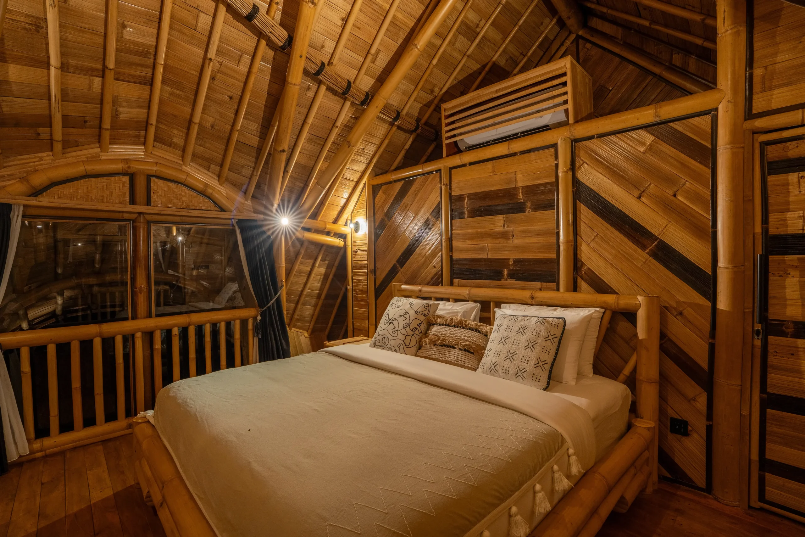 Stay and experience the unique and exclusive design of our bamboo villa, offering stunning sunrise and hill views in the heart of Sambangan Eco Village. This one bedroom villa features an exclusive design crafted entirely from sustainable bamboo, with an ironwood roof and beautiful teak wood flooring. It’s a unique place for honeymooners, peace seekers, writers, or anyone looking for relaxation and tranquility.